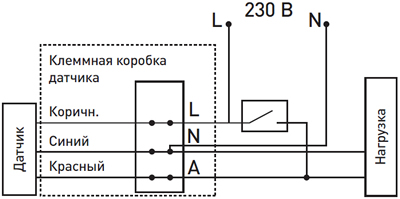 - Закрепите основной блок датчика на опорной поверхности и выполните электрическое соединение проводников питания и нагрузки с проводниками датчика в соответствии с нижеприведенной схемой.