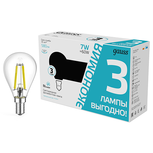 Лампы светодиодные Gauss LED Filament 105901207T (G45 шар, Е14, 7 Вт, 580 лм, 4100 К), комплект 3 шт.