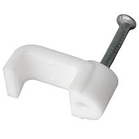 Плоский крепеж кабеля представляет собой П-образную пластиковую скобу с гвоздем.