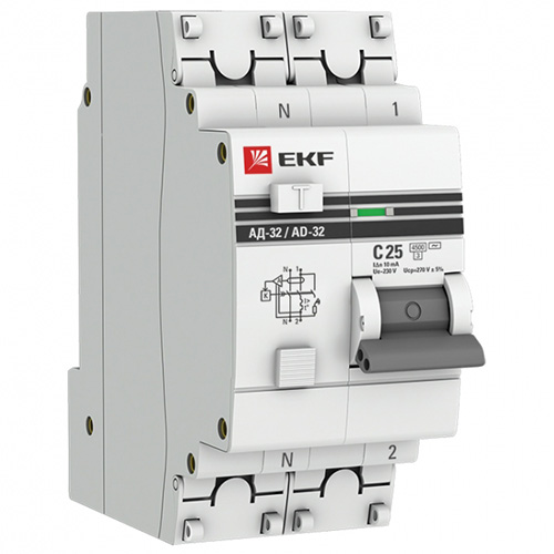 Выключатель автоматический дифференциального тока АД-32 1P+N 25А / 10мА (характеристика C, тип AC, электронный, защита 270 В) 4,5кА EKF PROxima