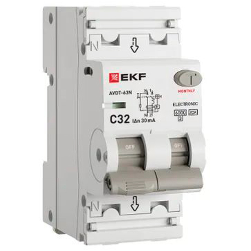 Автоматический выключатель дифференциального тока АВДТ-63N 1P+N 32А EKF PROxima (32 А, характеристика C, тип A электронный, 30 мА, 6 кА)