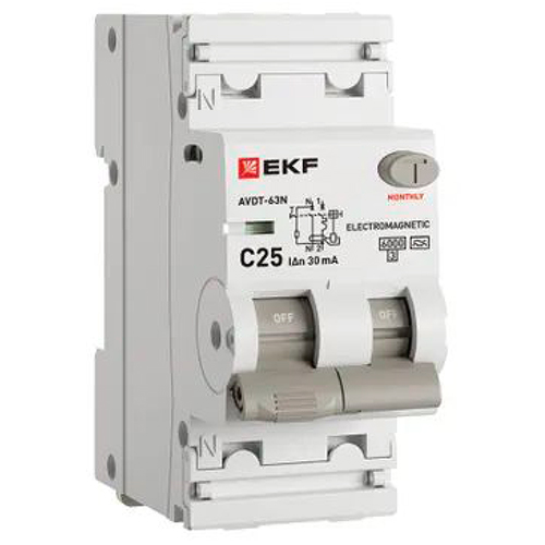 Автоматический выключатель дифференциального тока АВДТ-63N 1P+N 25А EKF PROxima (25 А, характеристика C, тип A электромеханический, 30 мА, 6 кА)