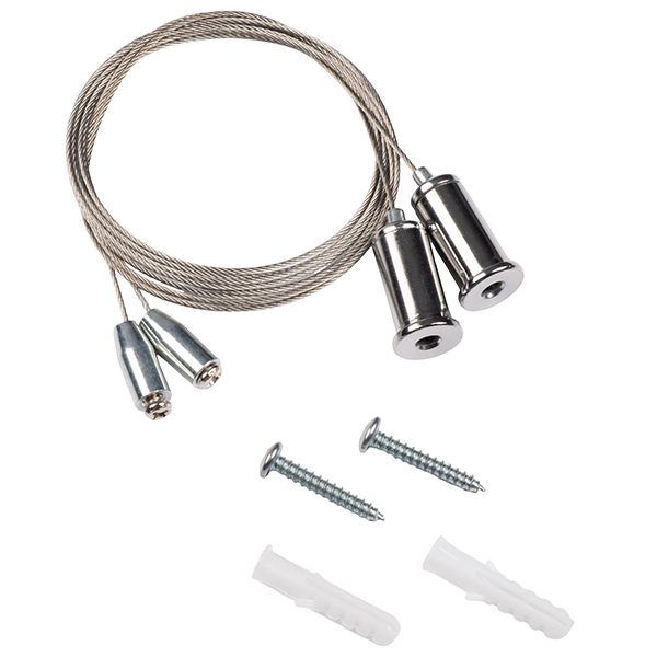 В комплект входят 2 стальных троса и 2 самореза с дюбелями.