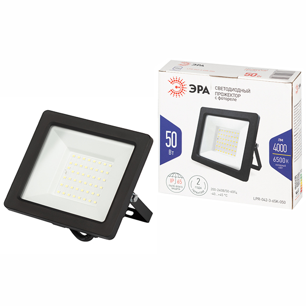 Прожектор светодиодный LPR-042-3-65K-050 "Эра" (50 Вт, 4000 лм, 6500 К, IP65) со встроенным фотореле, черный